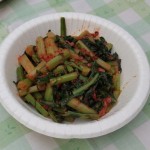 試食は茹でたものをツナマヨ和えとキムチ風の和え物に。生のノラボウ菜をベーコンと内藤トウガラシでペペロンチーノ風に炒めたものです。